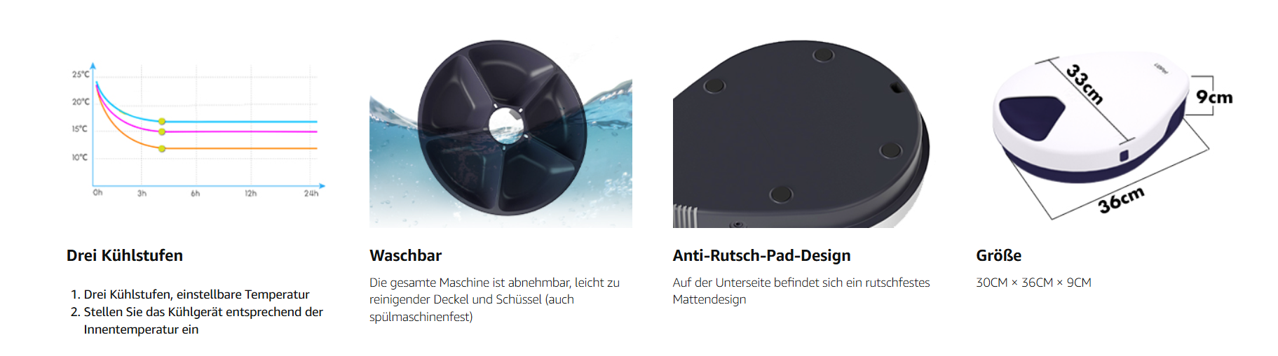 3 Kühlstufen: Einstellbare Temperatur von 10-15°C, um das Futter den ganzen Tag über frisch zu halten.