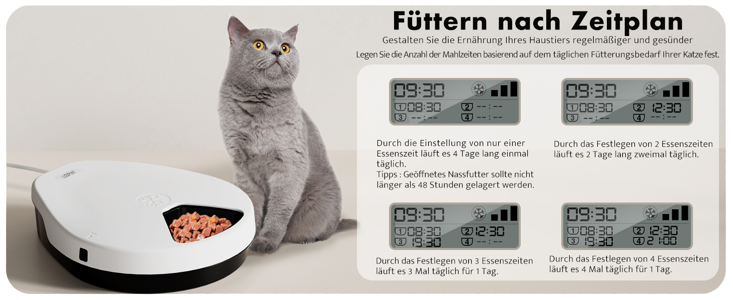 Flexible Timer: Wählen Sie, wie viele Mahlzeiten täglich und für wie viele Tage (1-4 Tage) – passend zu den Bedürfnissen Ihres Haustiers.