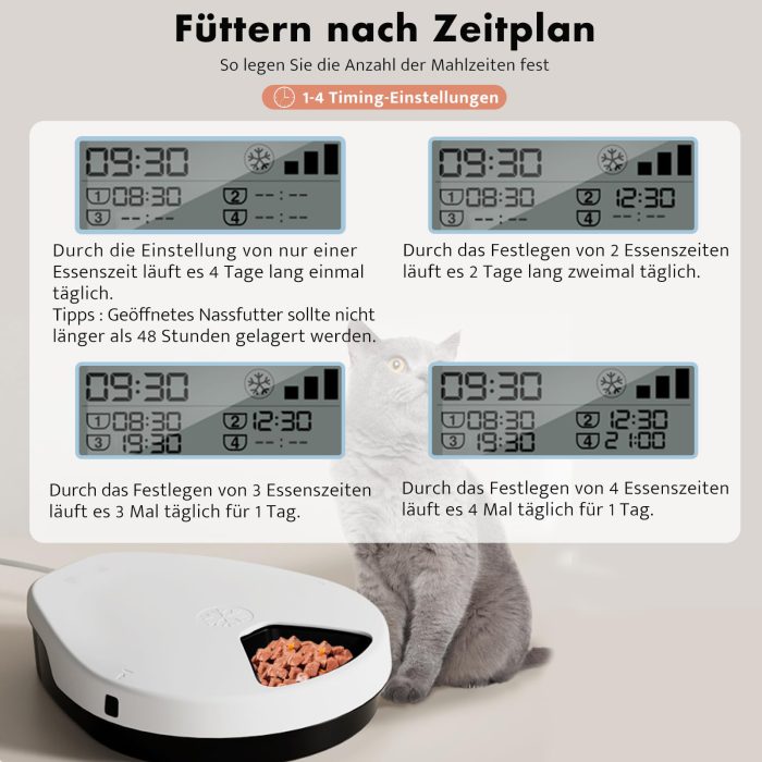 Flexible Timer: Wählen Sie, wie viele Mahlzeiten täglich und für wie viele Tage (1-4 Tage) – passend zu den Bedürfnissen Ihres Haustiers.